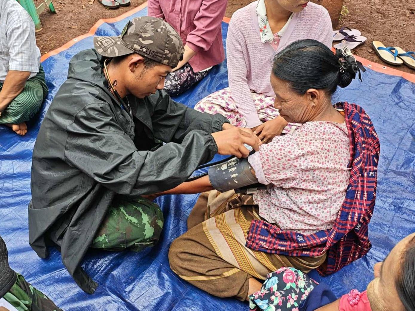 A Karenni Ranger takes the blood pressure of a woman who was forced from her home.