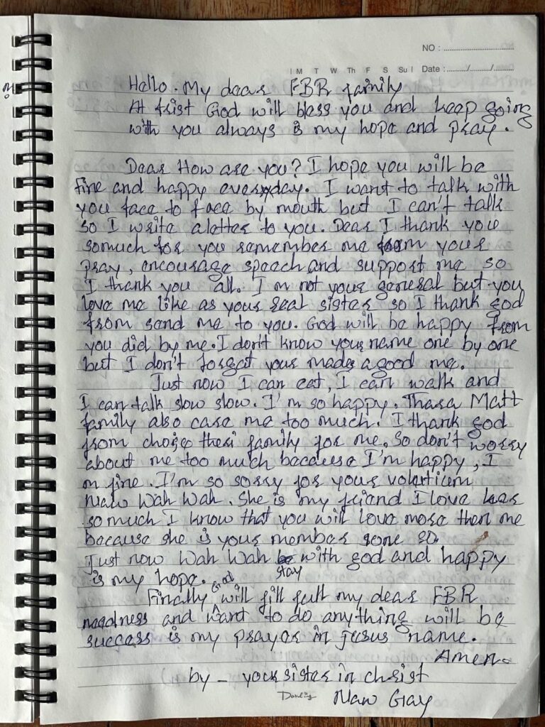 In September, FBR received a handwritten letter from Naw Gay, which provided updates on her recovery and expressed her love and gratitude for the support she’s received. She included a special thanks to Matt and Tanita and their family, local friends who have helped coordinate her care and walked beside her since she was evacuated to Thailand. Naw Gay’s perseverance and courage are inspiring as she pushes through such severe injuries, and her gratitude and grace are humbling. Here is what she wrote: