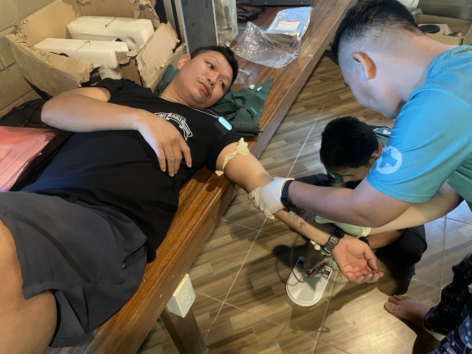 Ranger Saw Eh Lay donates blood for a new trainee. |