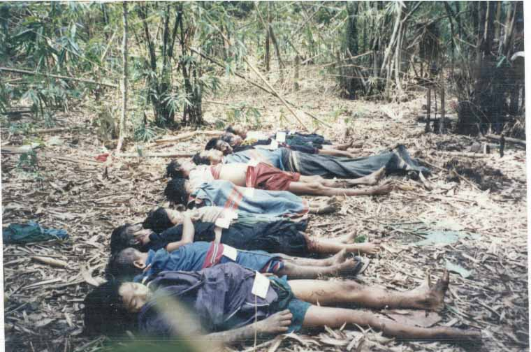 "I dont respect any religion, my religion is the trigger of my gun", were the words of Burma Army Column Commander Khin Mau Kyi, of IB 78 as he and his unit burned villages, churches, tortured pastors and tortured and urinated on the head of a Buddhist monk. LIB 301, LIB 416 also burned villages while IB 77, IB 75, and LIB 317 mortared, machine-gunned and forced villages to relocate.